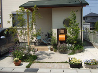 玄関が南側にあるお住まいは陽あたりを活かした明るいアプローチが造れます。門周りとアプローチまわりに様々な植栽を植え、緩やかな曲線の通路の両側に数種の落葉と常緑の雑木を植えると、緑のトンネルのような雰囲気のアプローチになります。